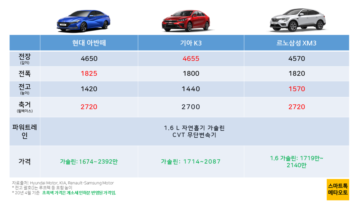 일단 차의 길이는 K3가 미세하지만 아반떼보다 깁니다. 휠베이스와 전폭은 아반떼가 더 우세합니다. 그럼 가격 비교를 해보겠습니다. 다만 K3가 옵션 조정으로 최하위 트림이 삭제되면서 비슷한 트림끼리 비교를 해보고자 합니다.