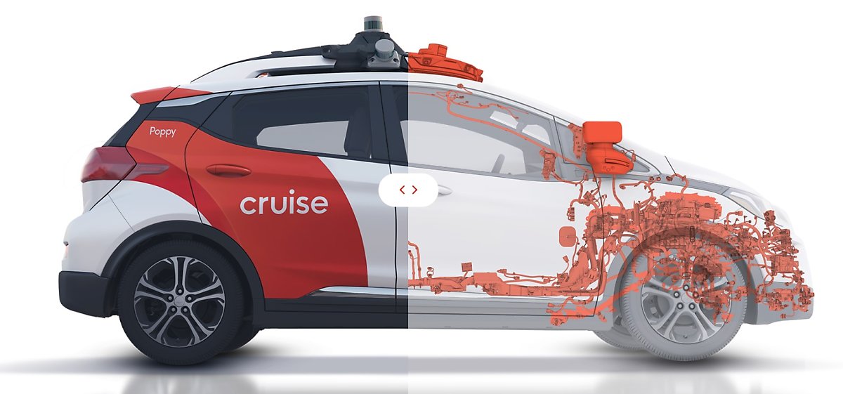 2018년도 기준 자율주행 기술이 가장 앞선 것으로 평가받는⁽ⁱ⁾ 제너럴 모터스 (GM)는 2016년 자율주행 자동차 업체인 크루즈 (cruise)를 인수했습니다. 이후 크루즈는 180대가 넘는 쉐보레 볼트 (Bolt) 자율주행차를 제작하여 테스트를 진행했으며, 2017년도 부터는 샌프란시스코 본사에 근무하고 있는 임직원들을 대상으로 '크루즈 에니웨어'라고 불리는 자율주행차 공유 프로그램을 서비스 중이라고 합니다.