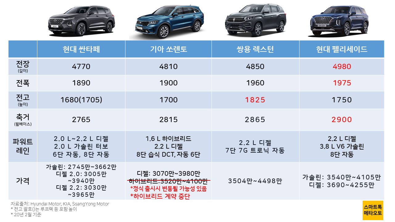 기아차의 4세대 쏘렌토는 '새로운 시대의 라이프 플랫폼'이라는 점을 강조하며, 20일부터 사전 계약에 들어갔습니다. 기존 쏘렌토보다 커진 사이즈와, 새로운 파워트레인을 갖추고 세상에 나올 준비를 하고 있는 쏘렌토와 가격대가 비슷한 차종 3종을 함께 비교해봤습니다.