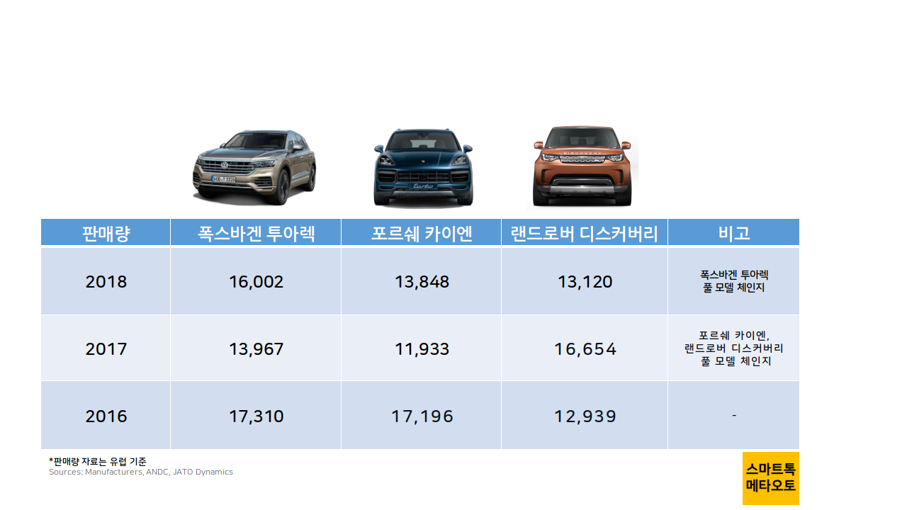 국내에서의 가격 갭차이는 상당하지만 유럽 내에서 디스커버리와 투아렉은 거의 가격 차이가 나지 않습니다. 카이엔과 투아렉은 시작가는 차이가 어느정도는 나지만, 투아렉의 고급 모델 라인업으로 가면 포르쉐 카이엔의 시작가를 뛰어넘는 경우가 발생하기도 합니다. 투아렉은 폭스바겐의 차량답게 무난한 디자인과 무난한 온 로드와 오프로드 성능을 가진 자동차로, 좋게 말하면 다재다능한 차량이고 좀 나쁘게 말하면 저 둘 사이에서 애매한 차량이 되어버리는 겁니다. 이는 판매량으로 나타나게 됩니다.